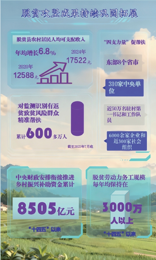 “十四五”以来,脱贫人口务工就业规模连续4年稳定在3000万人以上。据统计,脱贫县农村居民人均可支配收入从2020年的12588元增加到2024年的17522元。