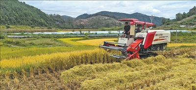 贵州省黔南布依族苗族自治州龙里县湾滩河镇翠微村,水稻开镰。梁士高熟稔地操纵着收割机。