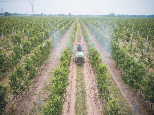 图为威县利派尔梨园内正在进行机械打药。受访者供图